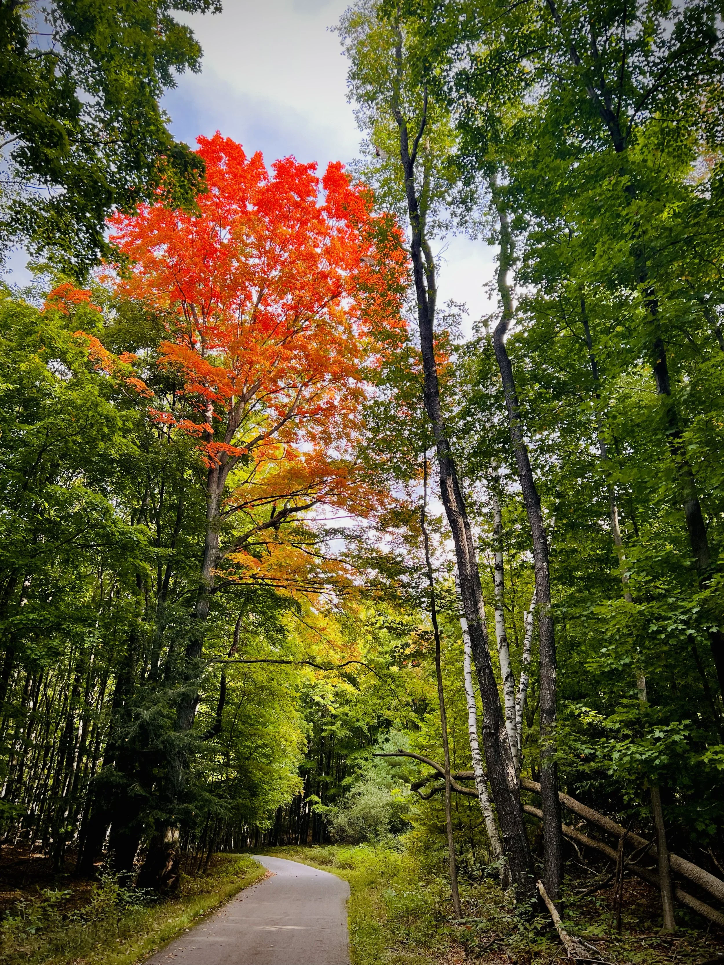 The trail winds through a wooded valley from Bar Lake Road parallel to Voice Road. It is not visible from Voice Road most of the way to M-22. This section of about 1.5 miles is mostly up hill (about 3-5% grade) until you get beyond the intersection of M-22 and M-109. There are some short steep grades (10-12%) along M-109 from the M-22 intersection. The trail runs parallel with and in view of M-109 for about 2 miles from this intersection to Pierce Stocking Drive. BE CAREFUL WHEN CROSSING THE ENTRANCE TO THE SCENIC DRIVE! This road gets a lot of traffic in the summer and drivers often aren’t looking for trail users.